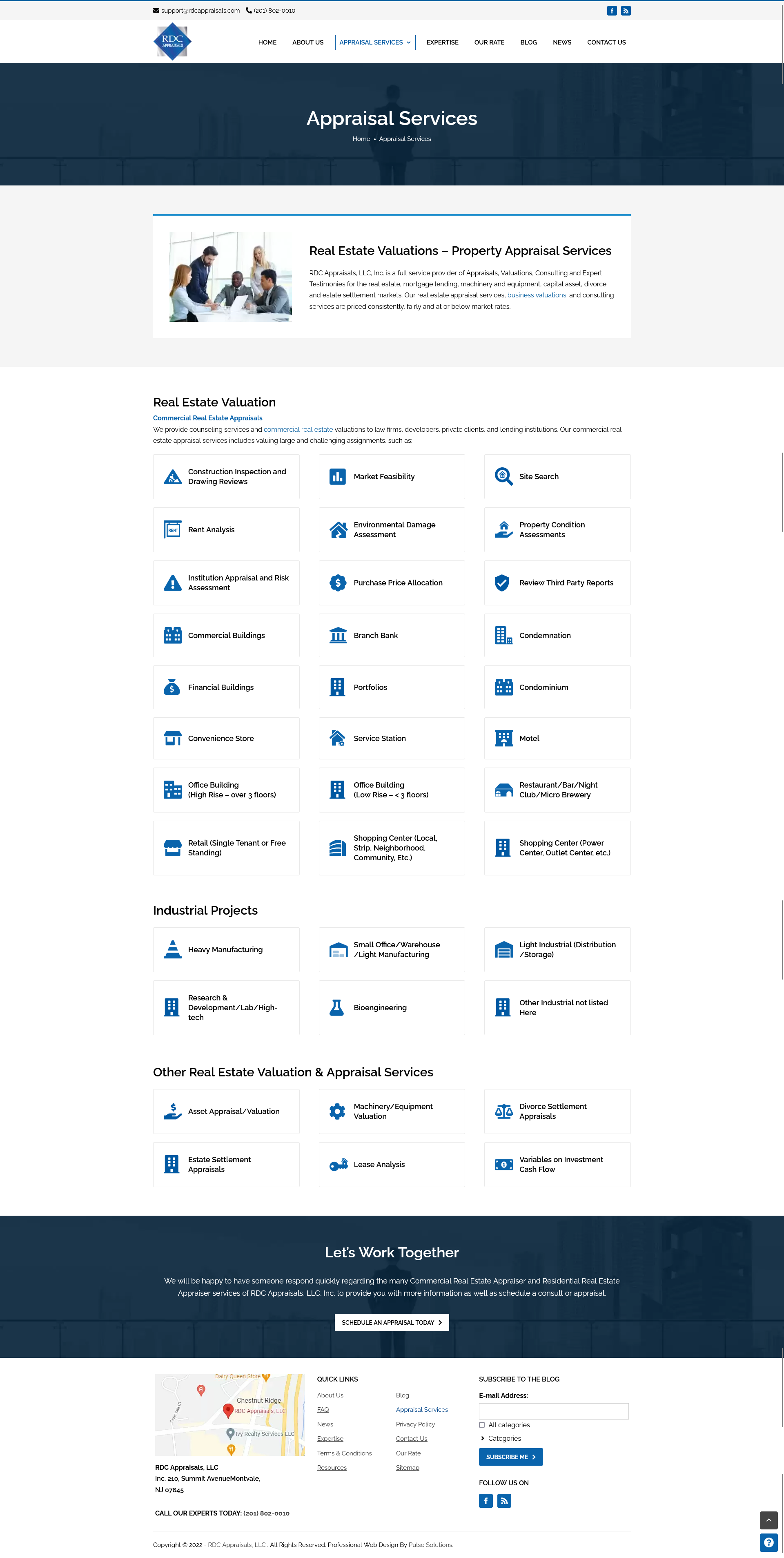 RDC Appraisals is a law firm in Montvale, NJ, and has long been a trusted real estate appraiser for nearly twenty years. The firm offers comprehensive business appraisal services across a range of personal and business matters across Appraisals, Valuations, Consulting, and Expert Testimonies for the real estate, mortgage lending, machinery and equipment, capital asset, divorce, and estate settlement markets.