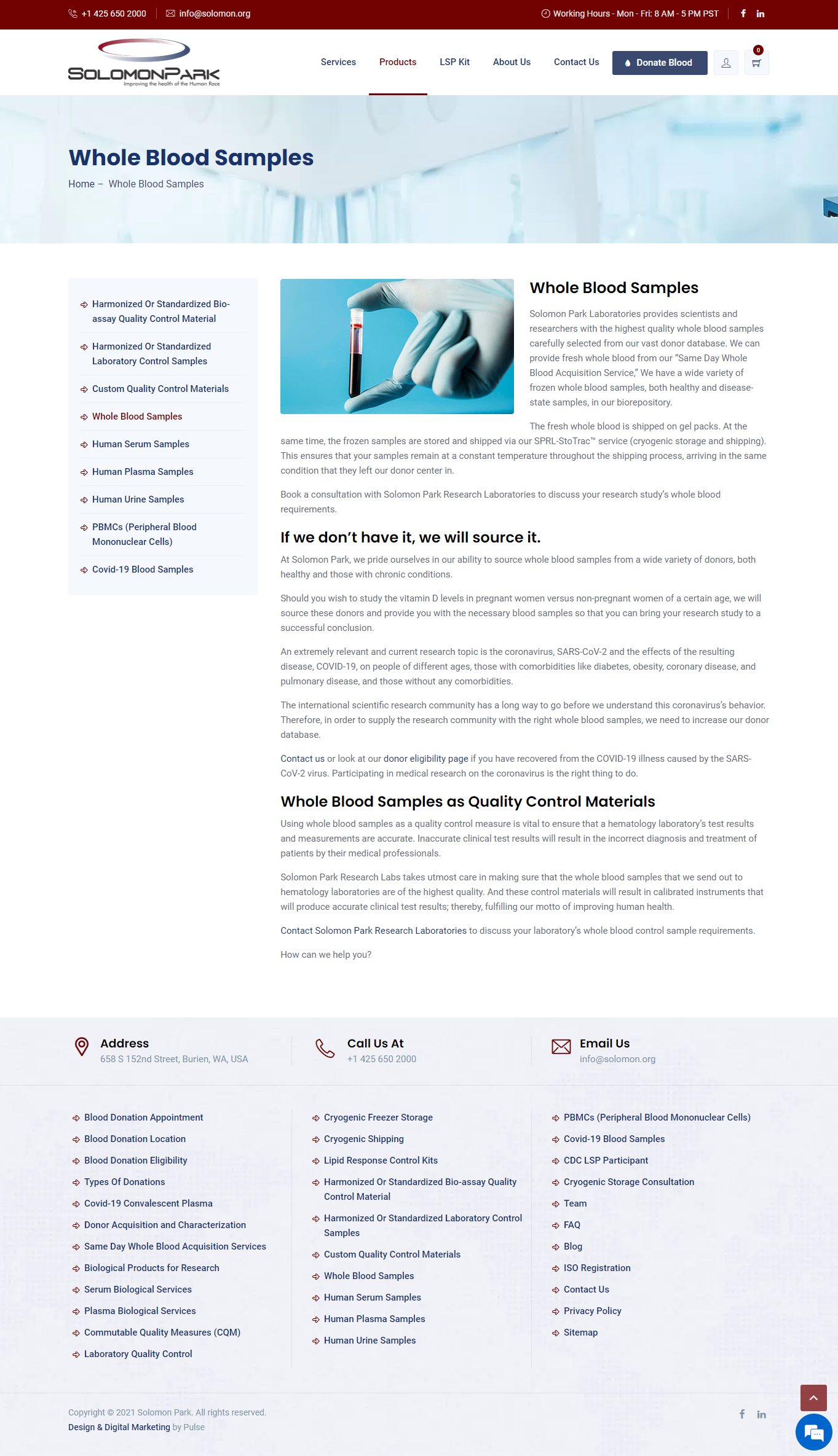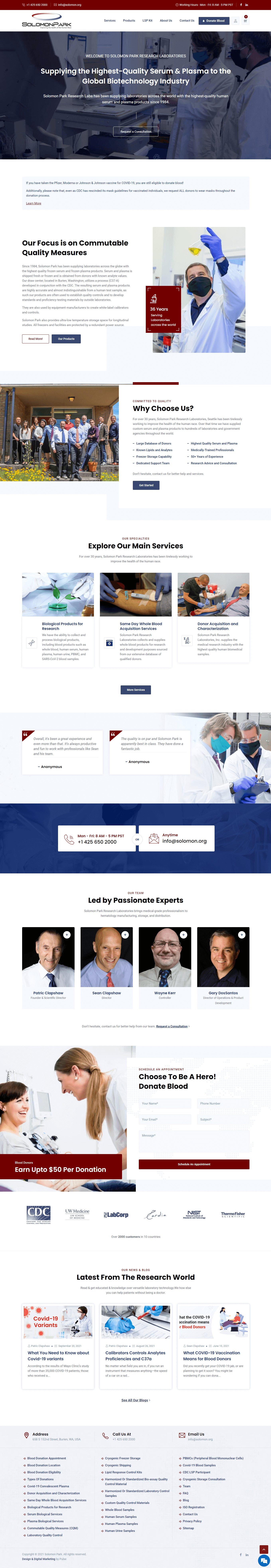 For over 30 years, Solomon Park Research Laboratories has been tirelessly working to improve the health of the human race. Over time, the lab has supplied custom serum and plasma products to hundreds of laboratories and government agencies worldwide. Serum and plasma is shipped fresh or frozen and is obtained from donors with known analyte values. Solomon Park also provides ultra-low temperature storage space for longitudinal studies. Their draw center, located in Burien, Washington, utilizes a process (C37-A) developed in conjunction with the CDC.